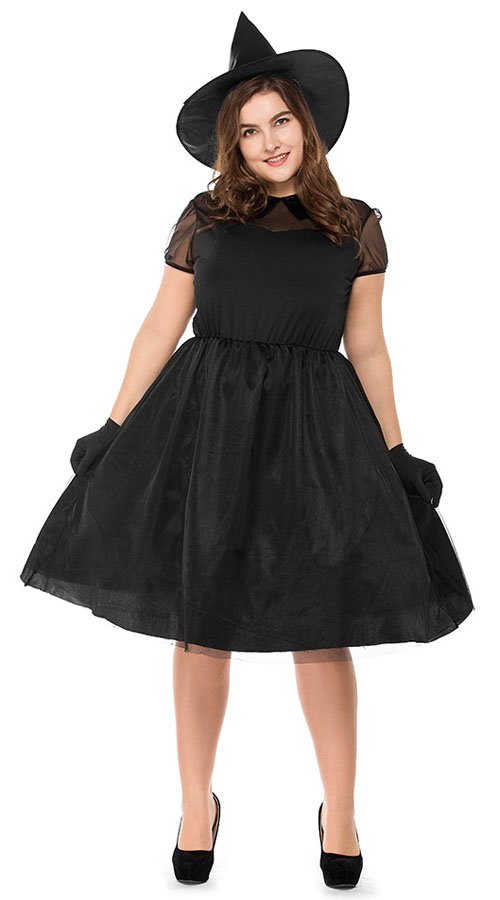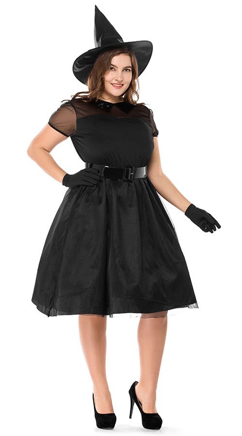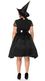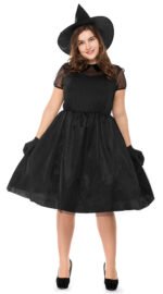 Även om alltför långa klädnader kan göra det riktigt svårt att ta sig runt med kvastskaft, så kanske något lite kortare skulle vara ett bättre alternativ för en häxa på språng. Förhäxad Halloween Häxdräkt omfattar en retroinspirerad svart miniklänning med puffärmar i mesh, knappdetalj, bälte, handskar och hatt.