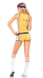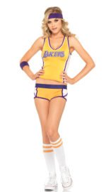 Denna sexiga cheerleader dräkt omfattar ett gult och lila lågskuret Lakers linne och ett par korta gula lila och vita basketshorts. Var beredd på att dra till sig uppmärksamhet och vända på dig när du går förbi.