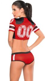 Denna fotbollsdräkt omfattar en kortärmad crop top med dubbelt noll screentryck fram och bak, randiga accenter och en matchande fräck trosa med en konstgjord strängdetalj framtill. byst: 80-90 cm, midja: 66-72 cm, topp: 30 cm, byxor: 24 cm